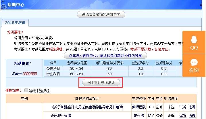 1、网上支付:点”网上支付开通培训“按钮,进入网上支付流程(下图所示)。