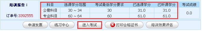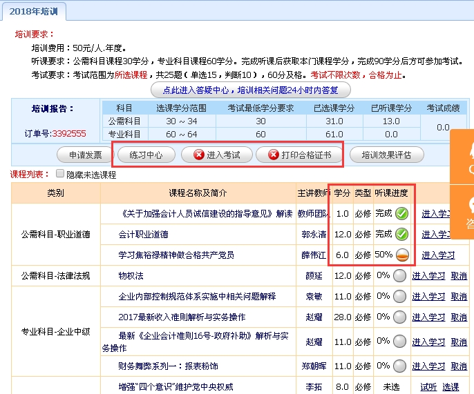 培训最低要求:公需科目30学分,专业科目60学分,,完成90学分后方可参加考试。选课总学分情况可以在培训报告中进行查看。听课进度”是指学员此门课程已经完成的学分,“培训报告“中的“已听课学分”需要达到“考试最低学分要求”。