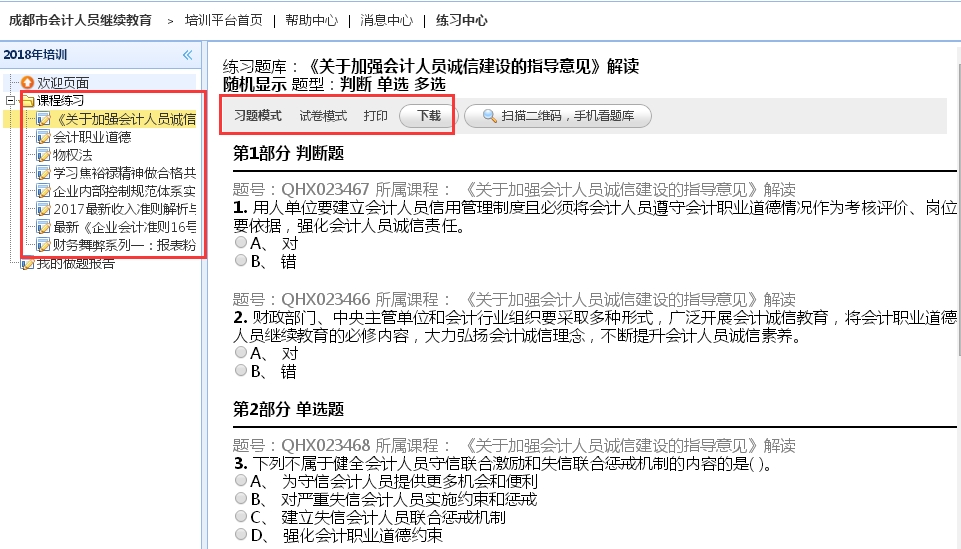 5、练习中心(课后练习):学员听课后,为方便通过考试,可以点“练习中心”按钮进入练习中心中做课程练习题目,考试题目是从练习题目中随机抽取。