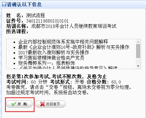学员完成规定的90学分后,方可进入网上考试。点“进入考试” 按钮进入到考试相关信息确认窗口,在确认窗口点“开始”即可开始考试。听课进度”是指学员此门课程已经完成的学分,“培训报告“中的“已听课学分”需要达到“考试最低学分要求”。