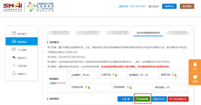 付费后,在“我的培训”菜单下,点击“申请发票”,根据要求填写开票信息即可。