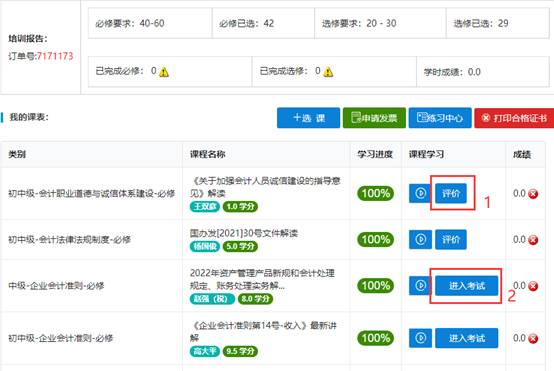 课程观看完毕后,需先“评价”课程,再参加此门课程的考试,考试合格(60分)后获得此门课程的学分。