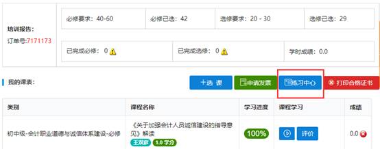 (1)练习中心:学员在听完课程后,可以先进入“练习中心“进行题目练习,再参加考试;考试题目和练习中心题目来自同一题库。
