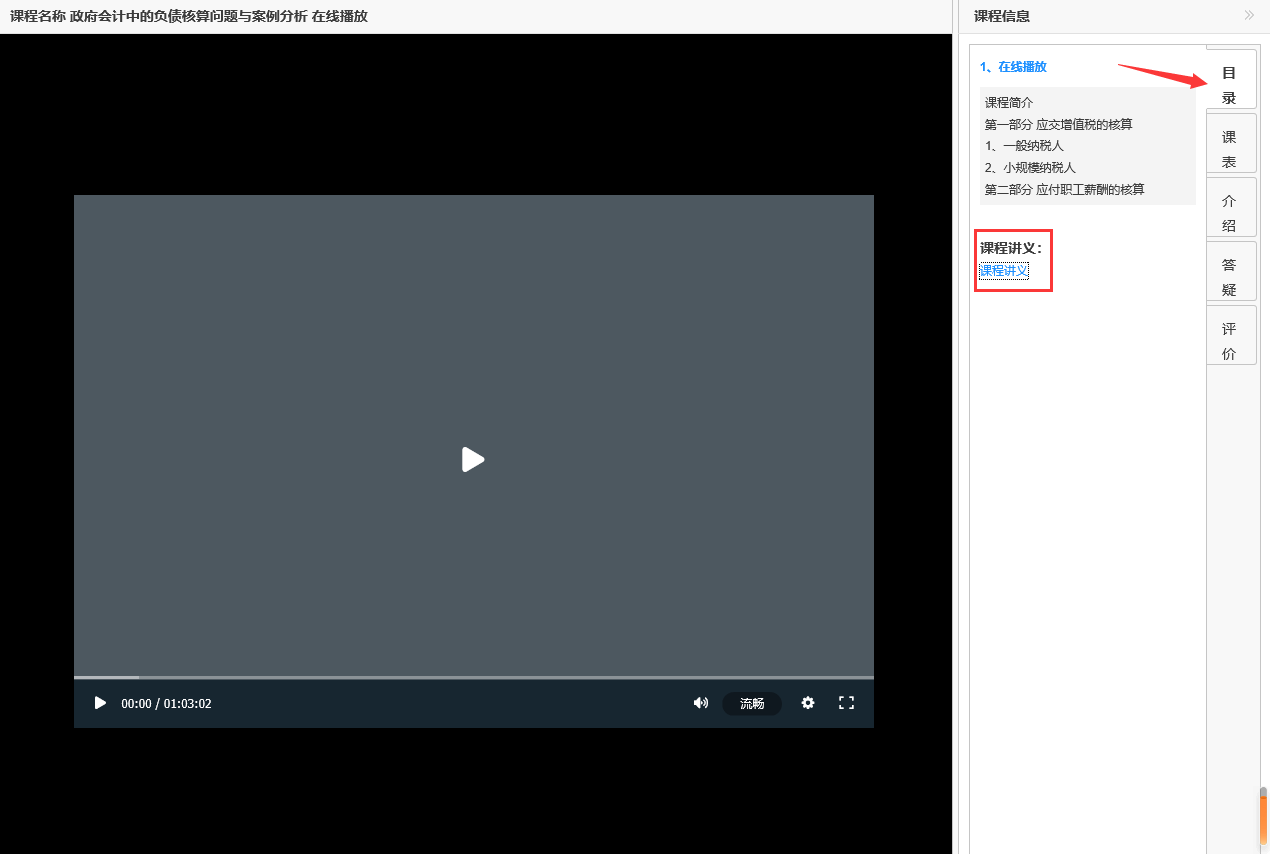 (3)讲义下载:在课程播放页面右侧目录按钮中,此门课程有讲义提供的话,可点击在线预览或下载